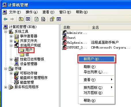2. 在弹出的计算机管理窗口,展开左侧菜单的“本地用户和组”下的“用户”,然后在右侧空白处点击鼠标右键并选择弹出菜单中的“新用户(N)...”。如下图所示: