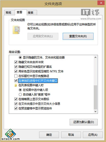 2、在文件夹选项中切换至“查看”选项卡,勾选“始终显示图标,从不显示缩略图”以及“在单独的进程中打开文件夹窗口”。保存并退出。