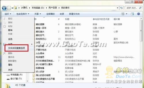第二步:单击文件夹窗口左上角“组织”按钮,并从弹出的下拉菜单中选择“文件夹和搜索选项”,打开“文件夹选项”窗口(如图2)。
