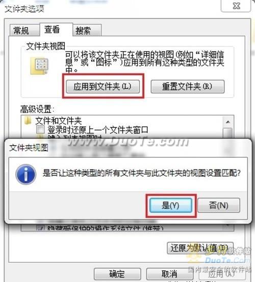 第三步:单击“查看”按钮,切换到“查看”选项卡,单击“文件夹视图”下的“应用到文件夹”按钮,弹出的“是否让这种类型的所有文件夹与此文件夹的视图设置匹配?”提示框,单击“是”按钮(如图3),即可同步所有文件夹的视图。