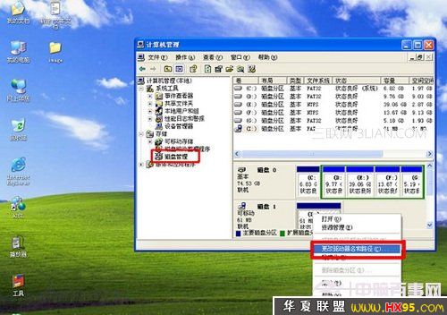 2.进入"计算机管理后",单击左面的"磁盘管理"选项,在右侧会显示计算机上所有的盘符,找到可移动磁盘(如图)