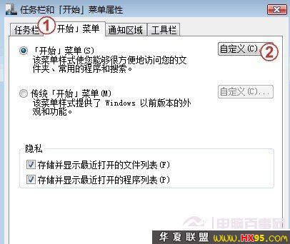 2、然后我再切换到“开始菜单选项卡”,然后我们点击“自定义”设置,如下图所示: