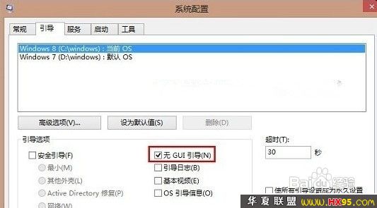 系统配置窗口中,首选切换到“引导”菜单,然后在“无GUI引导”前打个勾,基本上这步就又能节省两秒开机时间了,如下图