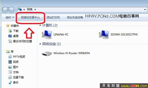 二、进入网络后,我们点击顶部的“网络和共享中心”,如下如: