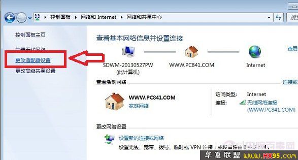 三、接下来我们将进入网络和共享中心界面,最后我们再点击进入左侧的“更改适配器设置”,如下图: