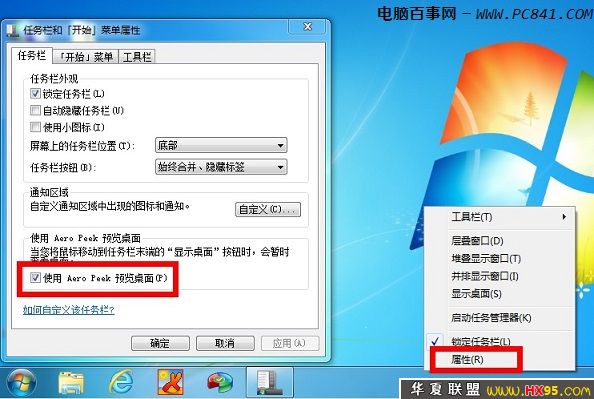 2、右击任务栏属性,看看是不是把预览桌面的选项关了,要是不小心取消了在给打上勾就行。