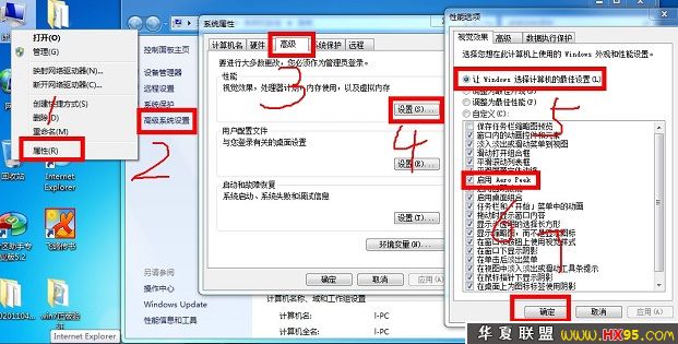 3、右击计算机----属性---高级系统设置----高级----性能--设置--视觉效果---让window选择计算机的最佳设置---记得启用 Aero peek的选项打上勾哦。