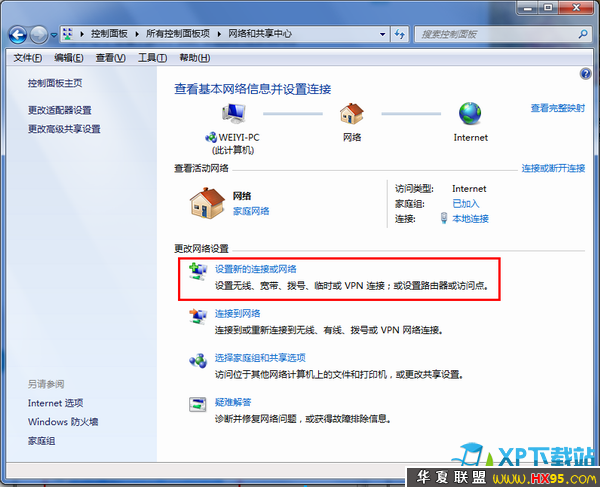 在“网络和共享中心”,在偏下部分,找到“设置新的连接或网络”