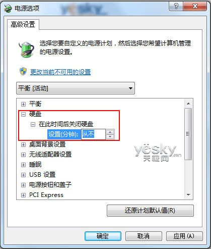 图示:设置从不关闭硬盘 接下来我们需要对Win7注册表进行一些小小的改动,操作很简单。