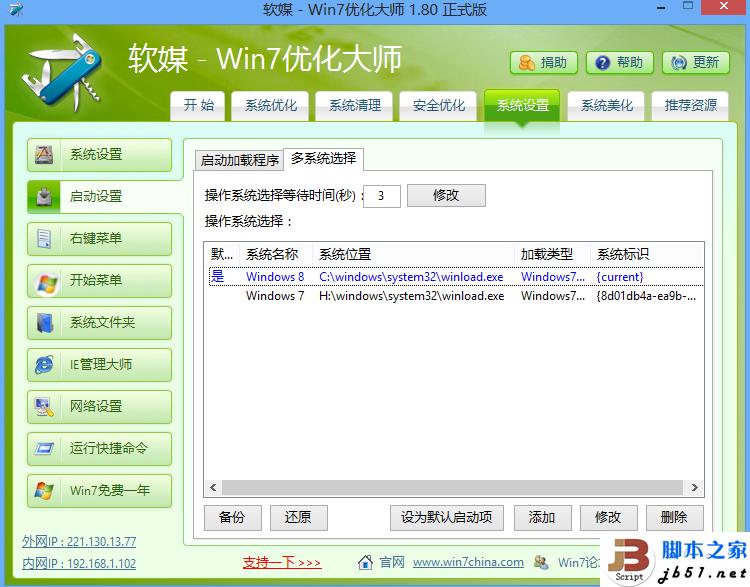 至于操作系统的显示文字你可以自己在win7优化大师里改,这个需要netframework3.5环境,我的win8里装了3.5,没有装的孩子可以在win7下运行,修改操作系统显示文字,我修改的是windows8和windows7,显示简洁,上下顺序可以调整,我的是把windows8放在上面的。
