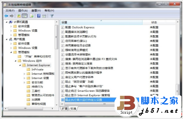 1、点击右下角开始菜单,在搜索程序和文件里面输入gpedit.msc之后按回车,打开组策略编辑器,一次点击:用户配置->管理模板->Windows组件->Internet Explorer,在右面的窗口中,找到'阻止执行首次自定义设置'双击打开.如下图