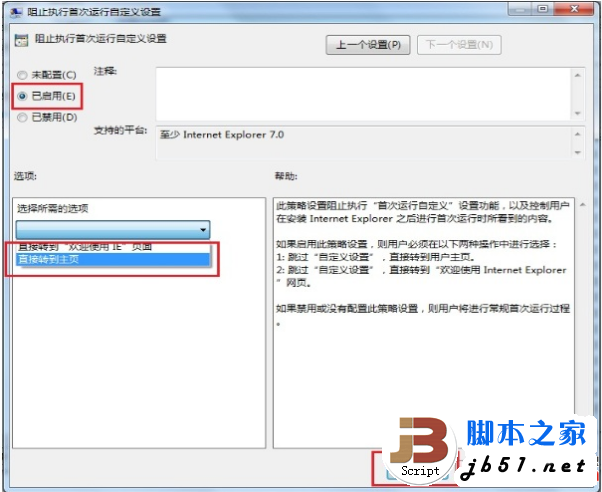 2、打开之后,选择“已启用”,在所需选择的选项下方,选择“直接转到主页”,之后点击确定,如图(3),再次打开IE后,不会在出现欢迎使用的画面。