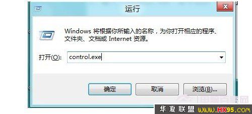 首先我们同时按键盘组合键:Win+R 打开Win8运行命令对话框(www.hx95.com),然后在运行对话框的打开中输入:control.exe ,然后点击下面的确定即可打开Win8控制面板,如下图: