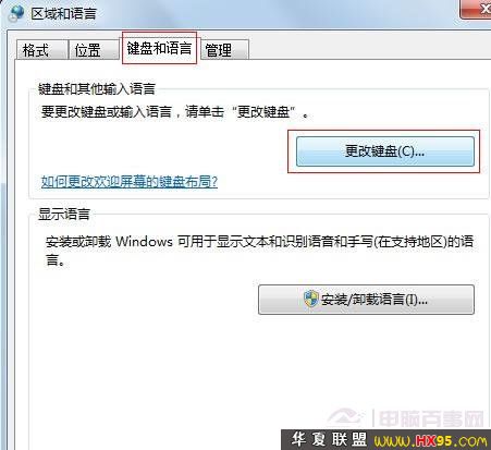 三、在“区域和语言”设置对话框中,我们首先切换到“键盘和语言”选项卡,然后再点击“更改键盘”按钮,如下图: