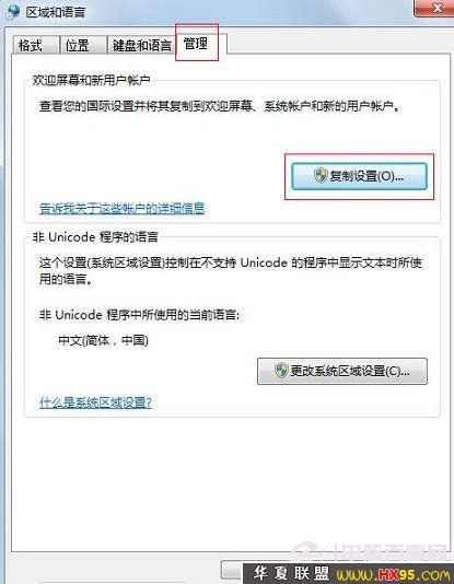 五、之后再返回到“区域和语言”界面,切换到“管理”选项卡,点击“复制设置”,如下图: