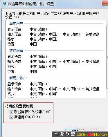 六:然后在复制设置对话框中,我们勾选上底部的“欢迎屏幕和系统账户”、“新建用户账户”两项,然后点击底部的确定即可,如下图: