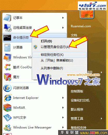 点击开始菜单 -》 所有程序 -》 附件 -》 命令行程序,右键菜单中选择“以管理员方式运行”。