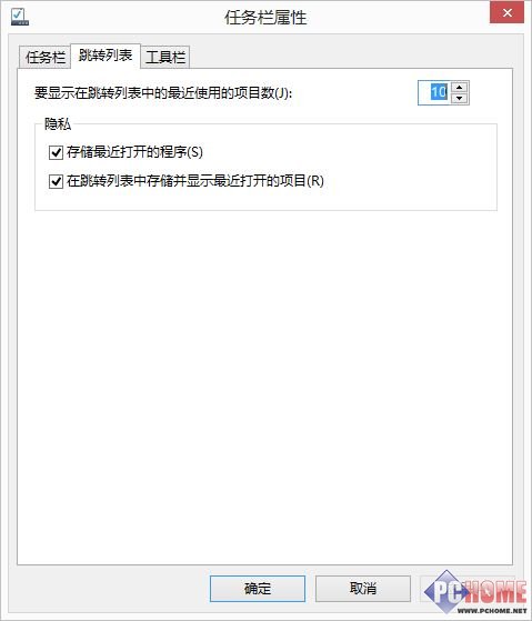其次,跳转列表选项取代了原来的"开始菜单"选项,可以设置在跳转列表中最近使用的项目数;可以勾选存储最近打开的程序;可以勾选在跳转列表中存储并显示最近打开的项目。