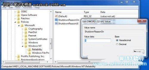 运行regedit>找到HKEY_LOCAL_MACHINESOFTWAREPoliciesMicrosoftWindowsNTReliabilityShutdownReasonOnShutdownReasonUI>设置下列键值为1。保存即可。