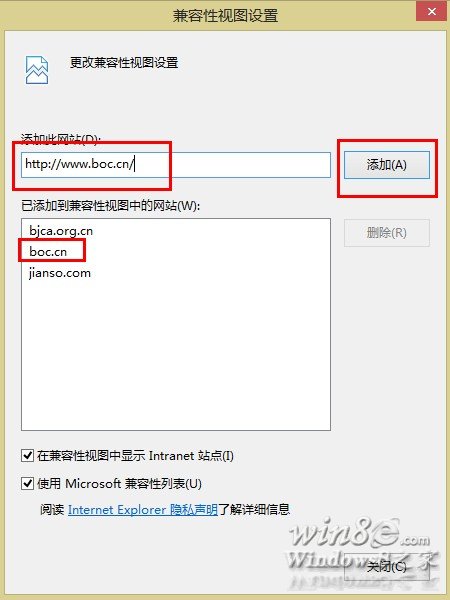 4.进入“兼容性视图设置”设置界面后,如下图添加你需要使用网银的网址: