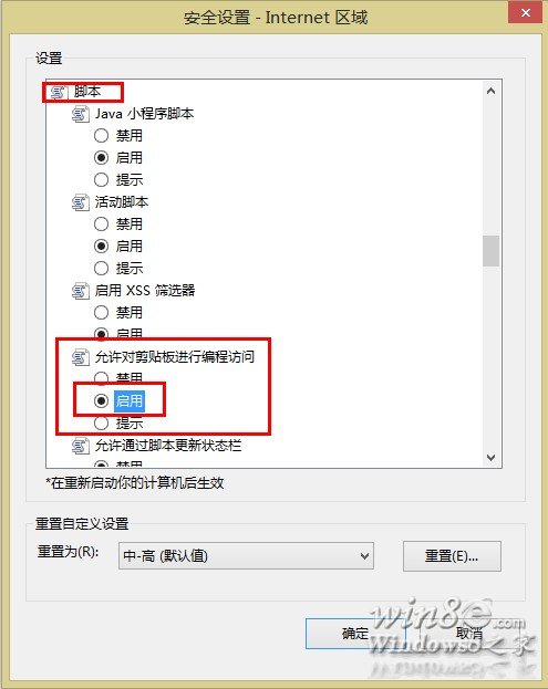 3.接下来,在“安全设置-Internet 区域”设置对话框中找到“允许对剪切板进行编程访问”并设置为“启用”单击确定即可,如图所示: