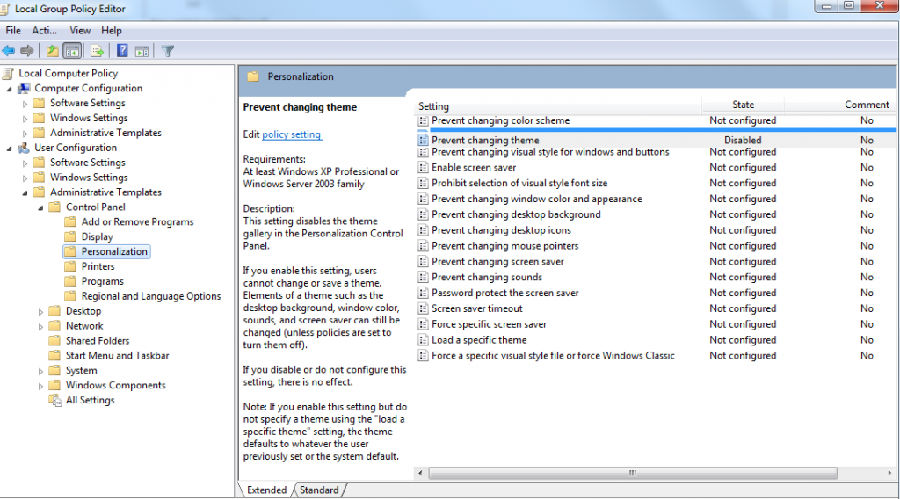 如果不是上面的问题,那就在运行里输入“gpedit.msc" ,出现以下界面,把User Configuration--->Administrative Templates--->Control Panel--->Personalization 里的选项Prevent changing theme 改成Disabled