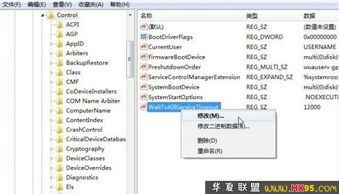 然后在注册表编辑器窗口中,按照以下路径依次找到HKEY_LOCAL_MACHINE/SYSTEM/CurrentControlSet/Control,此时可以发现其中有一项“WaitToKillServiceTimeOut”,用鼠标右键点击修改可以看到Windows7默认数值是12000,这就表示系统默认等待关机时间是12秒,如果想要加快关机速度,我们就适当把等待时间缩短,比如设置为7000(表示7秒)等。但这里提醒大家不要只追求快速,把数值修改太小那样对系统稳定性不太有利。