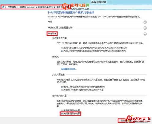6、在“控制面板”→“网络和Internet”→“网络和共享中心”→“高级共享设置”→“所有网络”;选择关闭密码保护共享,然后保存修改。