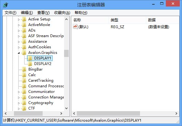 1. 前往注册表 HKCUSoftwareMicrosoftAvalon.Graphics,在下面,有几台显示器一般就会有多少个键,分别命名为 DISPLAY1, DISPLAY2, …, DISPLAYn. 我们需要做的,是点击到每一个 DISPLAYx 的键上面,在右侧删除所有的键值(键值"默认"除外)。正常的未进行 ClearType 调谐的样子应该是这样的: