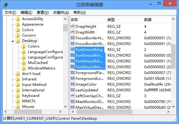 2. 前往注册表 HKCUControl PanelDesktop, 在下面,找到四个以 FontSmoothing 开头的键值,分别设置为 2,0,1,2 即可。