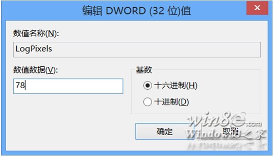 在注册表里面搜索 LogPixels ,将所有的键值不小于60的LogPixels 值修改为你当前用户的数值(在我这里,我需要将它们改为78)。这样就连以后新建的用户也可以使用指定的 DPI 而不用另外设置了(Win8e八亿网)。