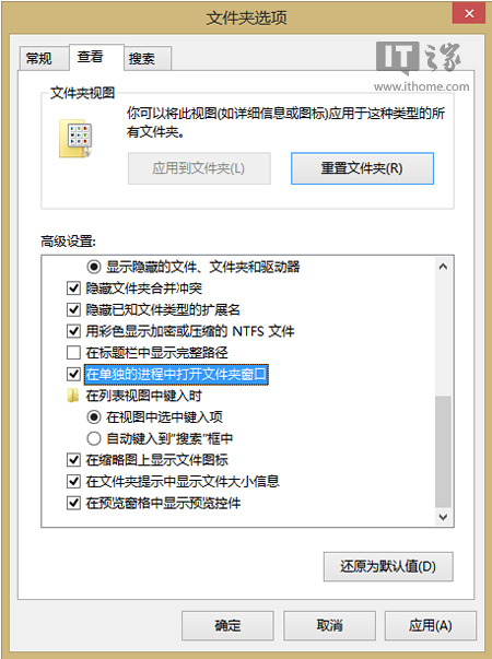 2、在文件夹选项中切换至“查看”选项卡,勾选“始终显示图标,从不显示缩略图”以及“在单独的进程中打开文件夹窗口”。保存并退出。