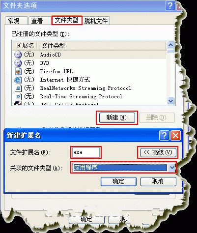 打开我的电脑→“工具”菜单→文件夹选项→文件类型→新建→在“文件扩展名”中输入exe→点击“高级”按钮→在“关联的文件类型”中选择“应用程序”即可,相关截图如下所示: