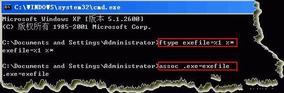 ②开始→运行→输入cmd,打开命令提示符窗口,分别输入两个命令(每输入一个命令后回车):ftype exefile=%1 %*和assoc .exe=exefile