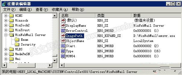 4、修改注册表中以下两处路径中ImagePath项为您所安装WinWebMail的实际路径: