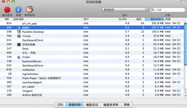 第一步、打开活动监视器(在应用程序→实用工具里可以找到)。
