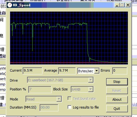 使用HD-Speed测速工具对服务器的系统盘、启动镜像盘以及游戏盘进行测速,发现当测启动镜像盘时,磁盘速度只有几M/S 如下图所示: