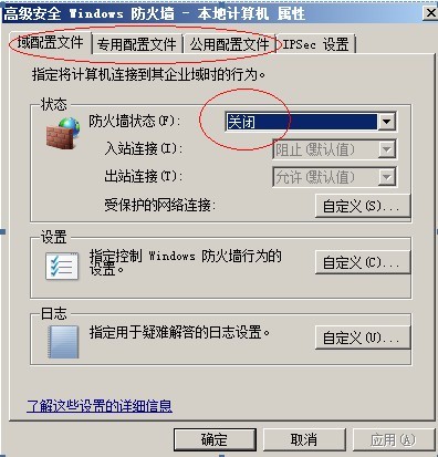4.在[域配置文件],[专用配置文件],[公用配置文件]等界面内防火墙状态选择,全部选择为 – [关闭]