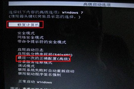 2.重启按住F8进入系统高级选项模式,然后选择最后一次正确配置恢复系统。