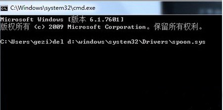 4.如果无法进入的话,则进入带命令提示符的安全模式下,在命令提示符中输入del X:windowssystem32Driversspoon.sys 命令删除报错文件即可。