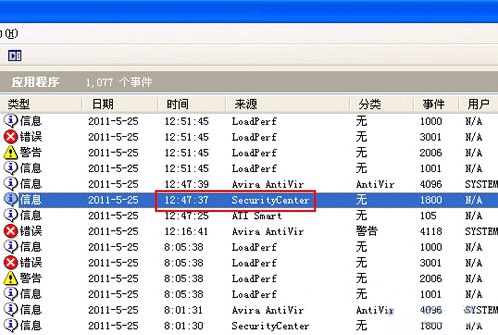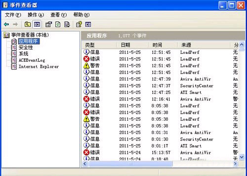 打开“控制面板”→“性能和维护”→“管理工具”→“事件查看器”,我们先切换到“应用程序”这一栏如下图1。