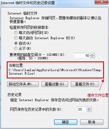 在Windows 7,IE中,工具 → Internet 选项 → 在第一个也就是“浏览历史记录”后面的设置,点击设置 → 弹出一个窗口中有一个当前位置,就是你的IE的缓存位置了。
