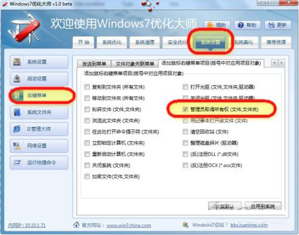 这里说的优化工具有很多种,一般支持WindowsVista的优化工具,都能用来优化WIndows7,比如Vista优化大师,Vista总管等,当然那些专门设计给Windows7的优化软件也可以达到一样的效果,比如Windows7优化大师、Windows7总管等等。这些工具中的系统设置中,右键设置都有添加获得管理员权限的功能。