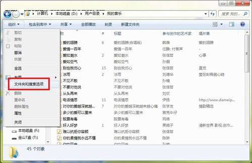 第二步:单击文件夹窗口左上角“组织”按钮,并从弹出的下拉菜单中选择“文件夹和搜索选项”,打开“文件夹选项”窗口。