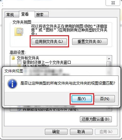 第三步:单击“查看”按钮,切换到“查看”选项卡,单击“文件夹视图”下的“应用到文件夹”按钮,弹出的“是否让这种类型的所有文件夹与此文件夹的视图设置匹配?”提示框,单击“是”按钮,即可同步所有文件夹的视图。