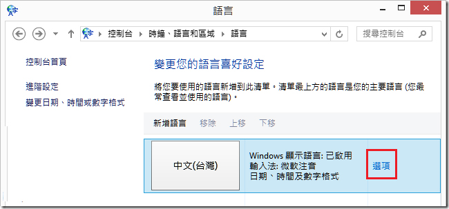 2. 点选【中文(台湾)】旁的【选项】