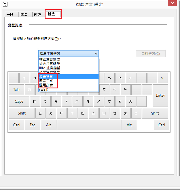 4. 然後在【微软注音设定】视窗中,点选【键盘】页签,然後您会看到下方有一个键盘对应的下拉视窗,点开之後,您会看到有多种键盘配置可以选择。其中有【汉语拼音】、【国音二式】、【通用拼音】三种不同的拼音方式可供选择。
