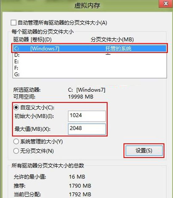 4. 在“虚拟内存”设置框内,选择要设置虚拟内存的盘符如图中的“C:Windows7”在“自定义大小”中设置初始大小和最大值硬盘空间大可以多设置点(用户可以自行设置)填入完成后,单击“设置”→“确定”即可。
