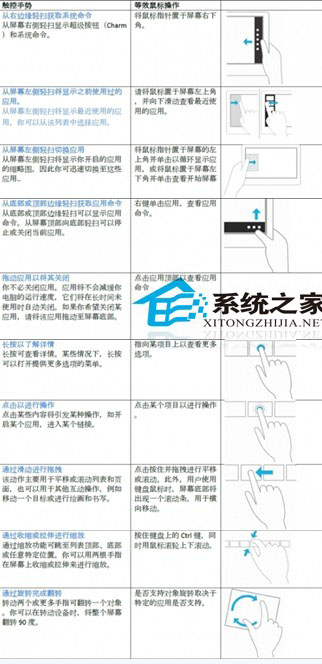 为了给习惯使用鼠标键盘的朋友提供更多Windows 8的触控操作信息,小编整理常用Windows 8触控操作表如下,表中详细介绍了各种触控手势及相关操作含义.