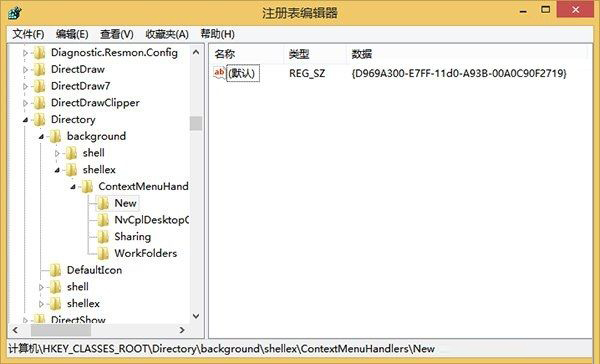 2.展开“HKEY_CLASSES_ROOTDirectoryBackgroundshellexContextMenuHandlersNew”键值;